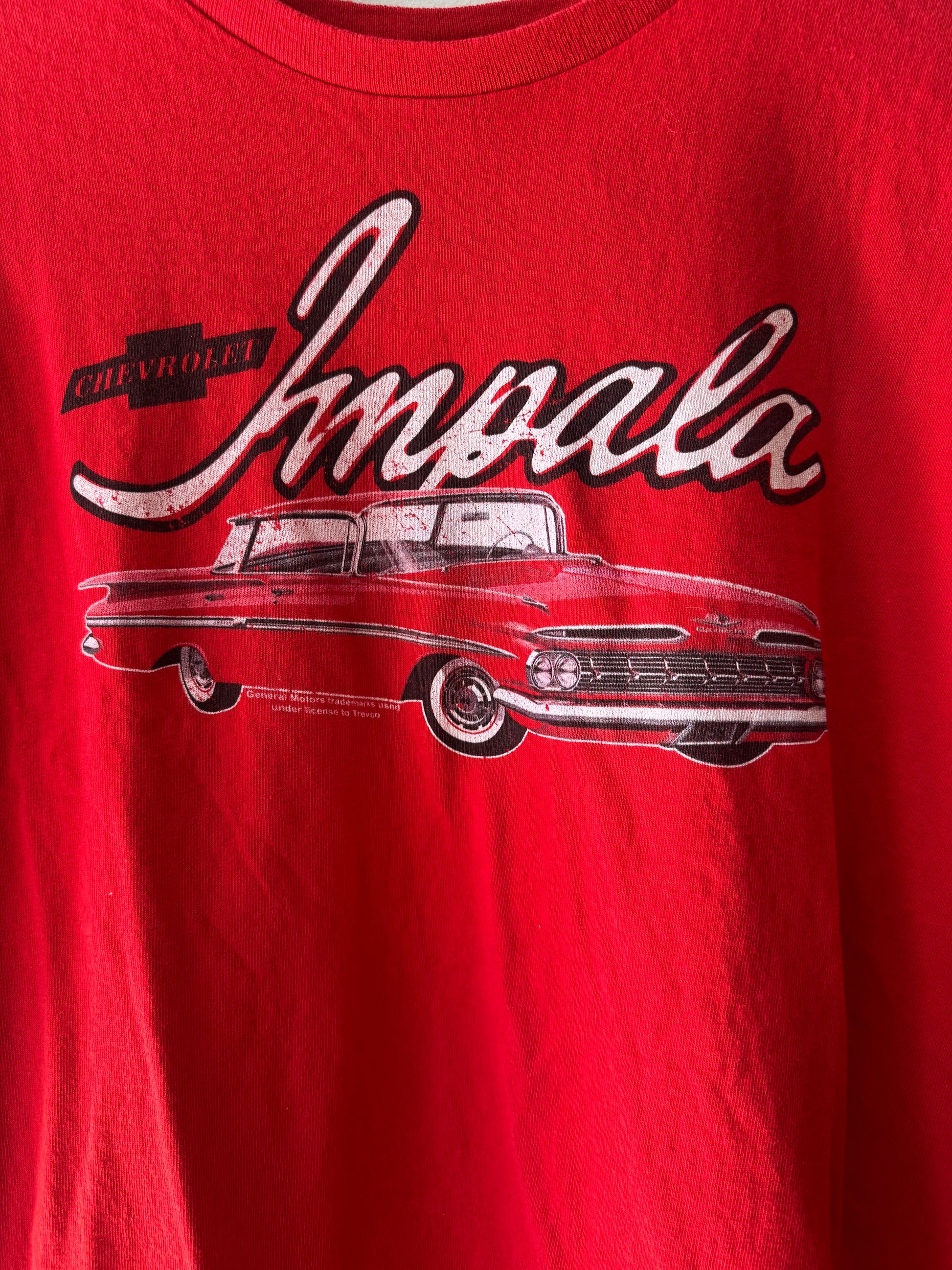 Vintage Chevrolet Impala tee printed on a soft Delta Pro Weight blank. Classic early 2000s car culture piece with bold red color and distressed print — timeless, easy to style, and built for daily wear.