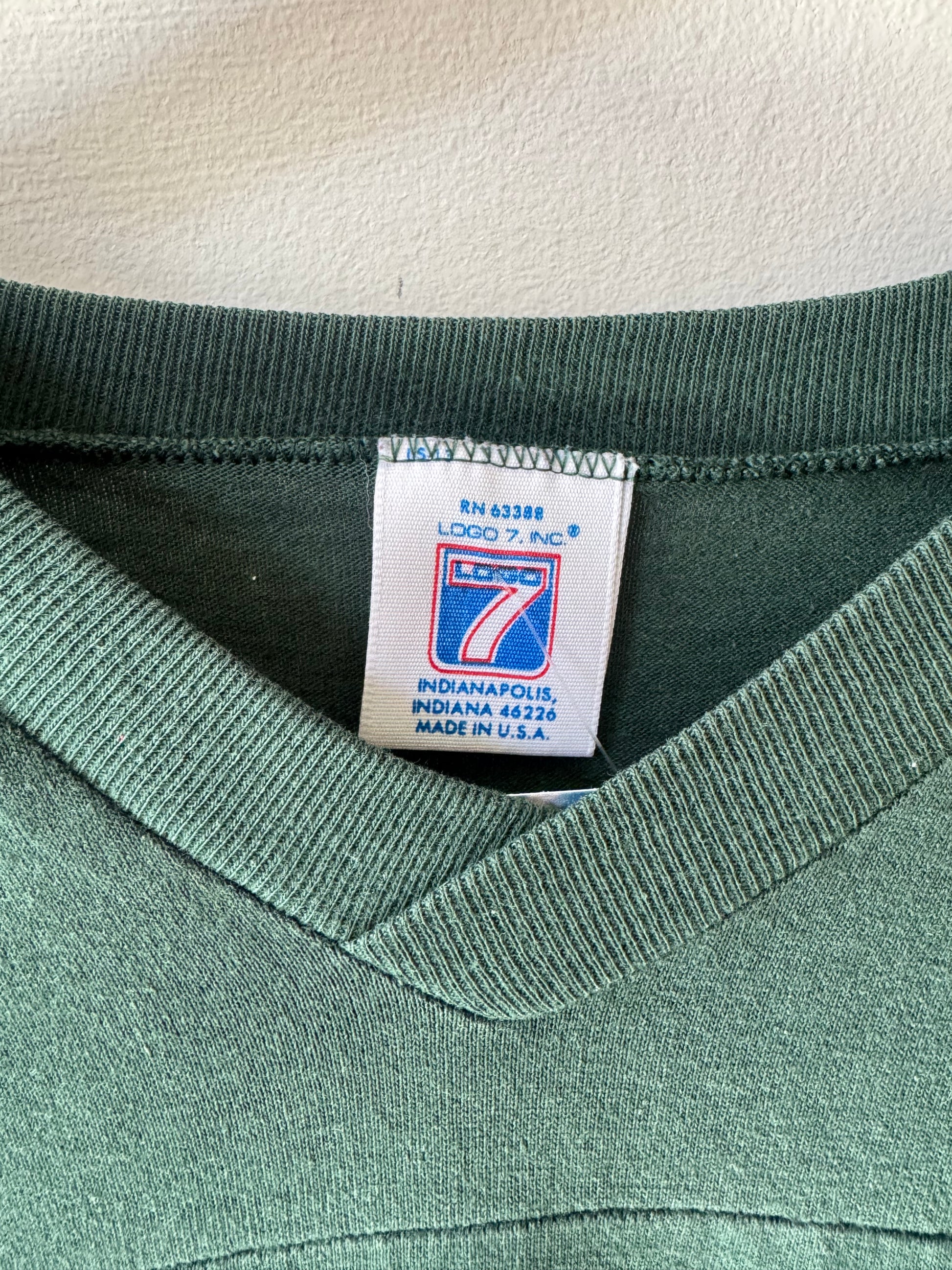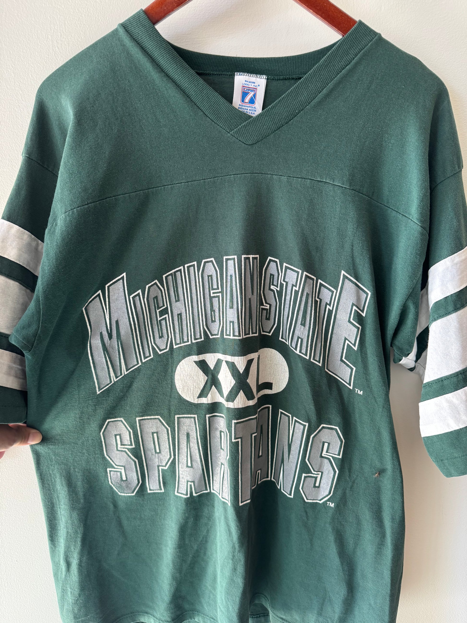 Vintage Michigan State Spartans jersey tee from the 1990s. Made in the USA by Logo 7 with classic sleeve stripes and bold collegiate lettering. A perfect oversized fit and true Spartan nostalgia.