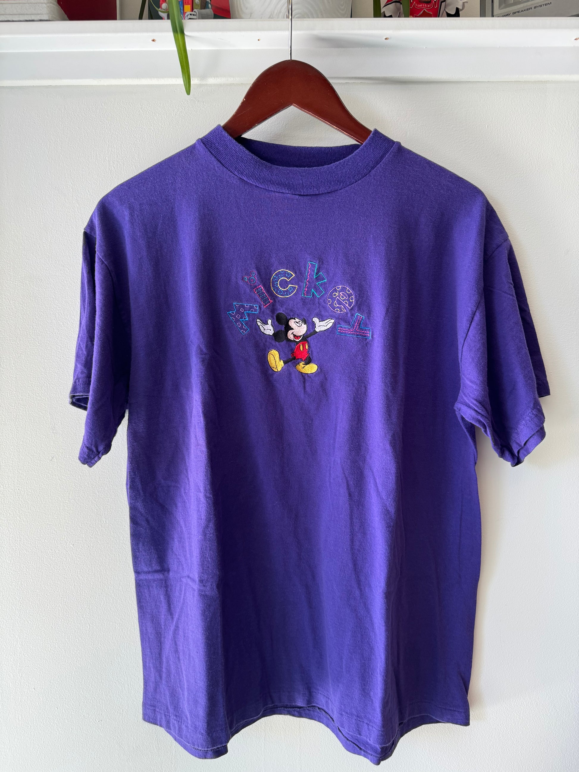 Vintage Mickey Unlimited tee from the 1990s. Bright purple cotton base with fully embroidered Mickey and playful multicolor “Mickey” lettering. A timeless Disney classic and rare colorway that pops.