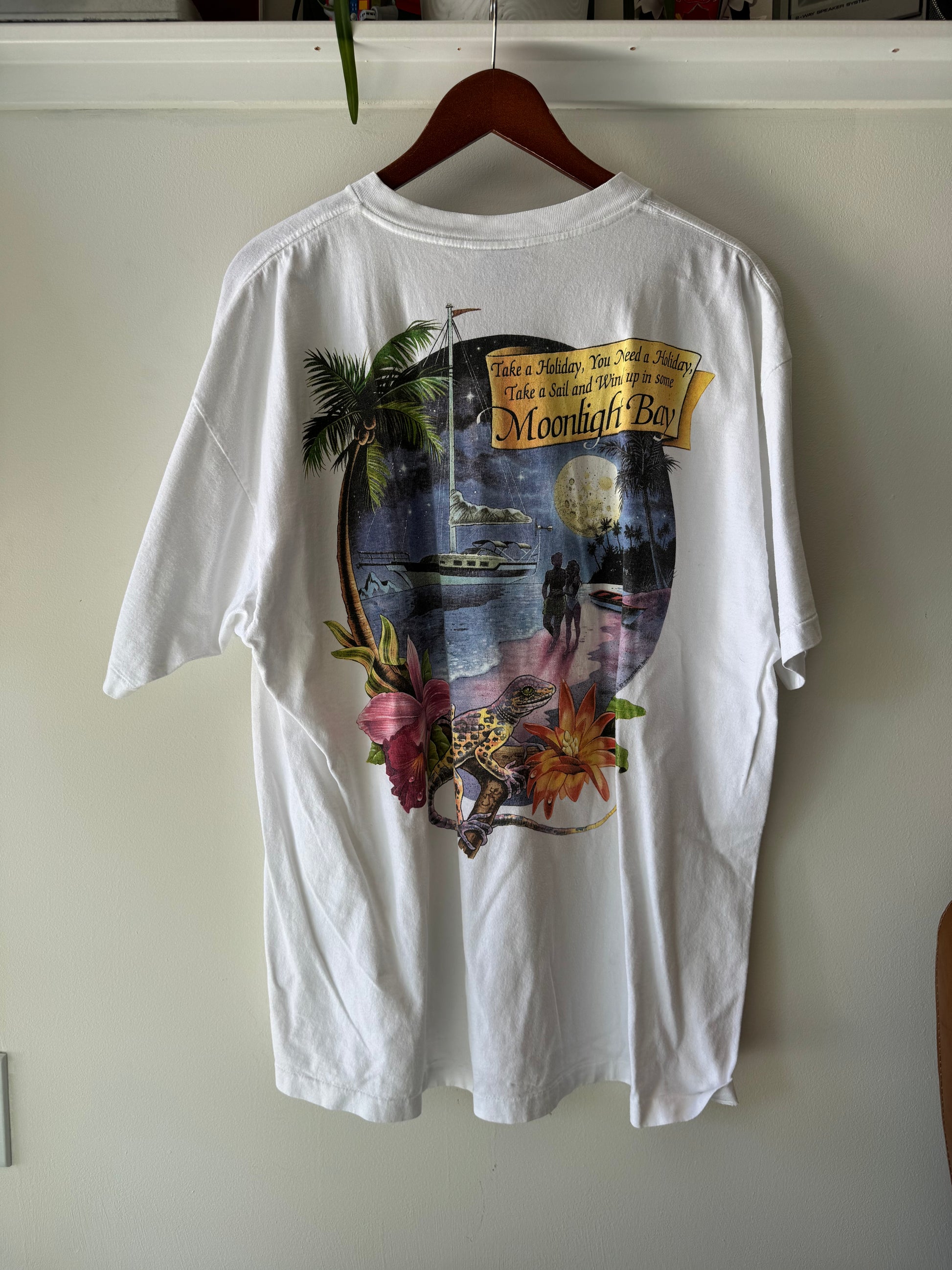 Vintage 90s Moonlight Bay tee featuring a colorful tropical back graphic and small gecko chest print. Soft cotton feel, perfect for summer styling or layering under an open shirt.
